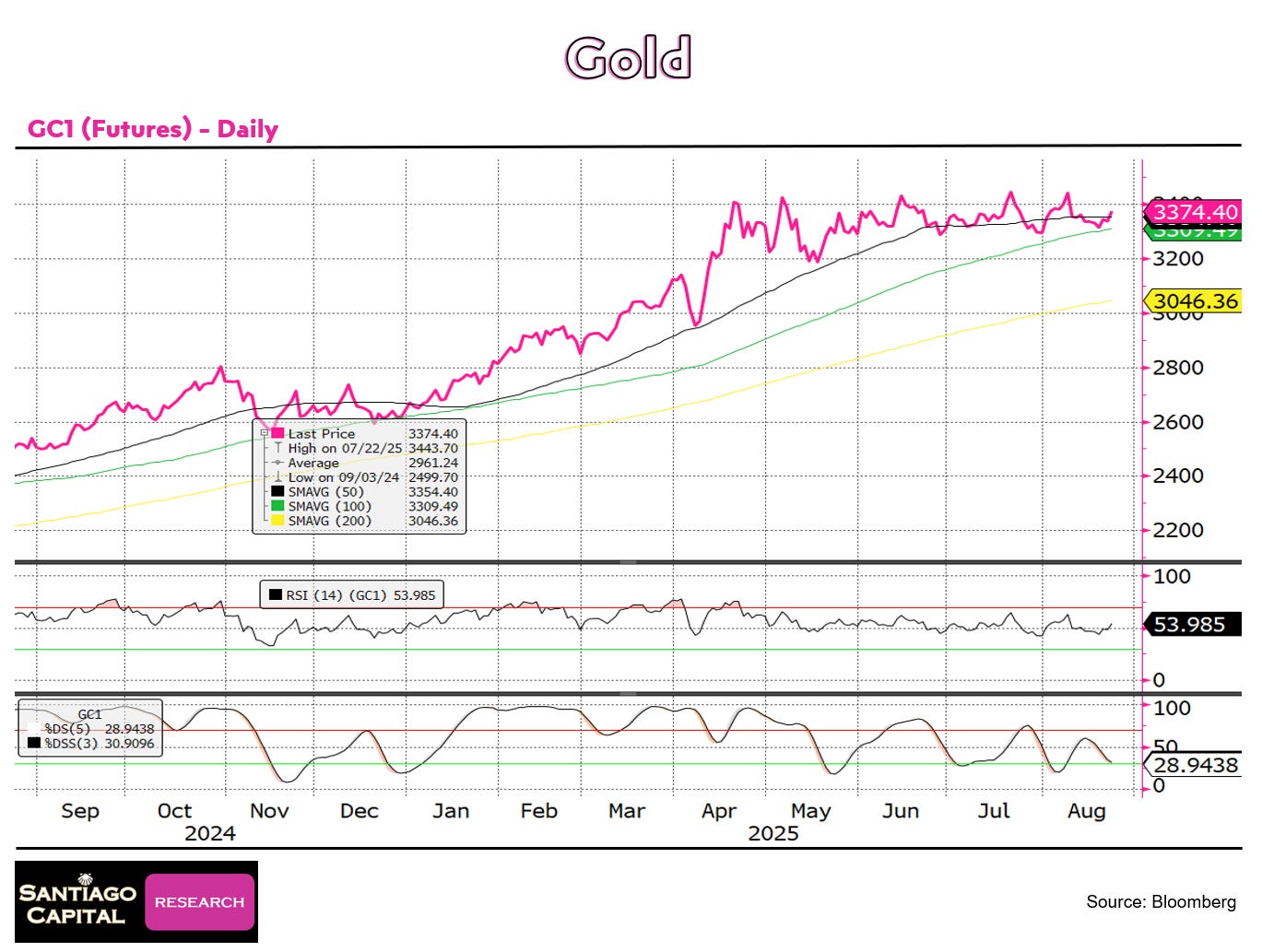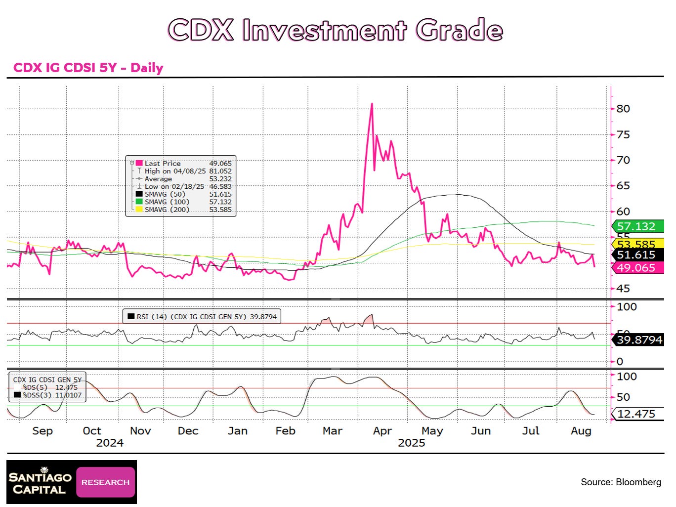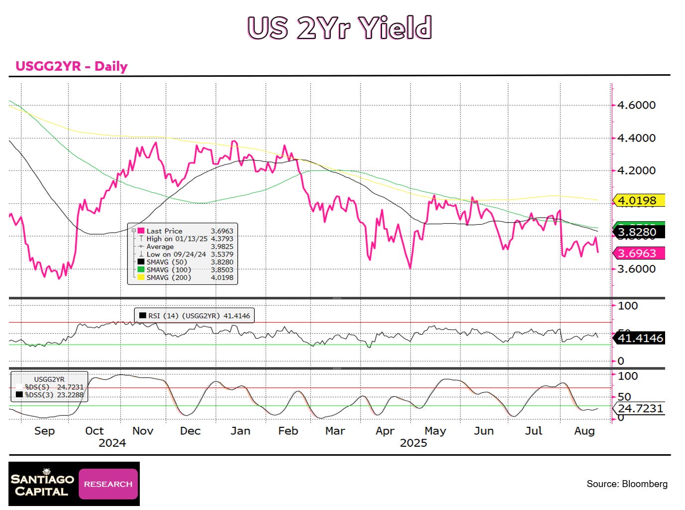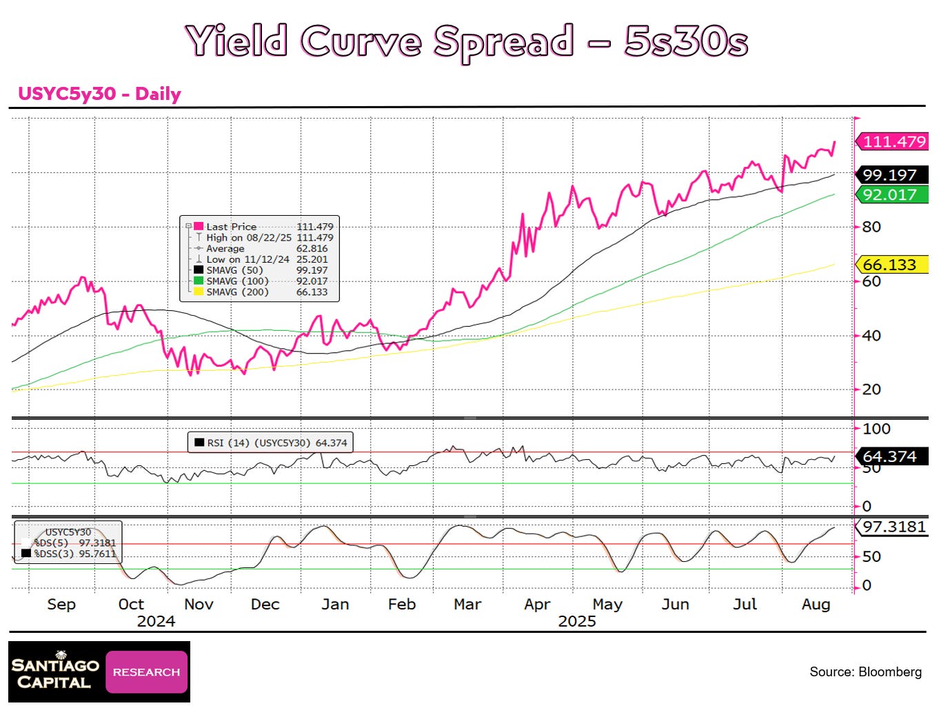 In fixed income, the front end of the U.S. curve continued to ease, with 2-year yields slipping into oversold territory while the long end stayed firm. The net result was a powerful steepening, with both the 2s10s and 5s30s spreads moving to levels not seen in months. Technicals show the steepening trend remains strong, but stretched momentum warns the move may be overextended.