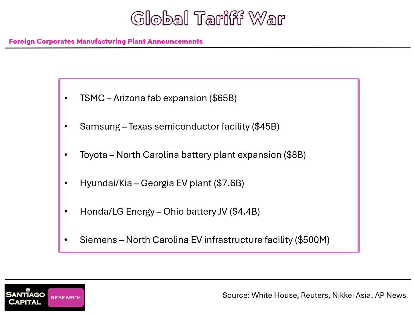 And the manufacturing boom? It's no mirage. Announcements flood in: TSMC expanding chip plants in Arizona, Samsung in Texas, Toyota in North Carolina, Hyundai in Georgia, Honda in Ohio, Siemens back in the Carolinas.