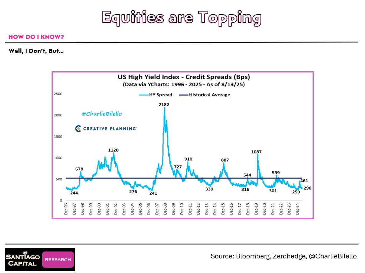 Shift gears to the credit world, where things look eerily calm. High-yield credit spreads…the premium companies pay over safe Treasuries…are at near 30-year lows.