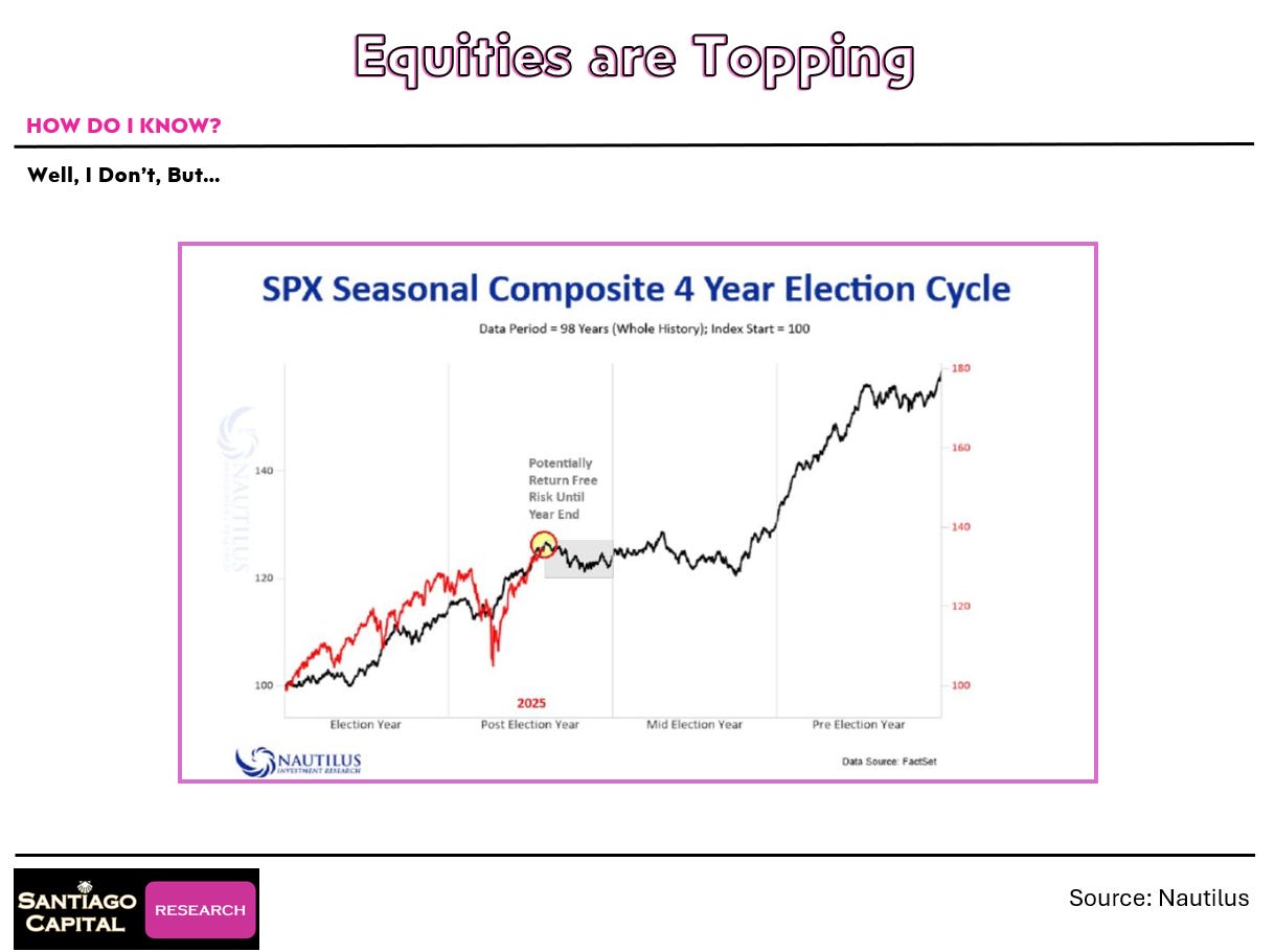 The four-year election cycle shows we're entering a phase where stocks typically go sideways or down. September and October? Notoriously volatile.