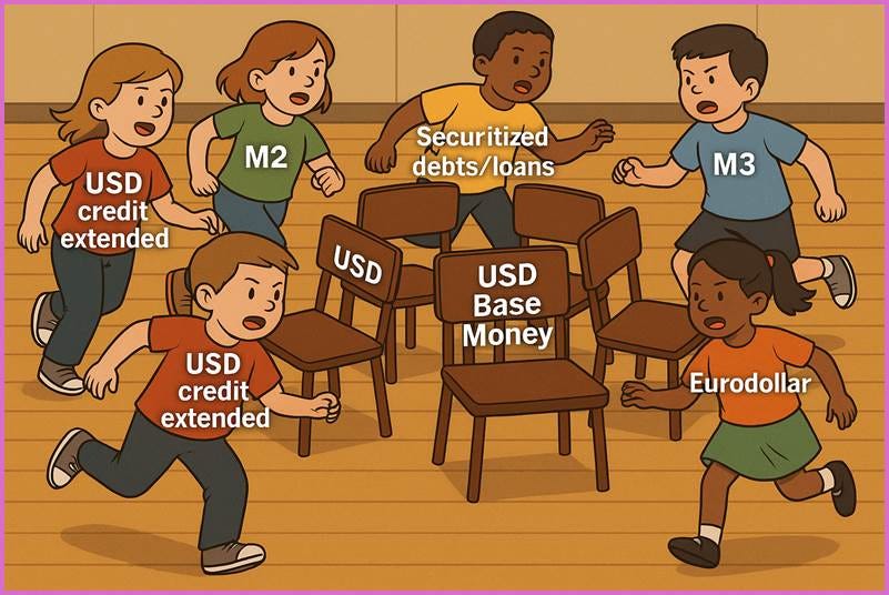 …whether it is M2, M3, certificates of deposit, securitized debt obligations, collateralized loan obligations, bank-issued credit, or even Eurodollar liabilities…should be thought of not as chairs, but as the people circling the chairs.