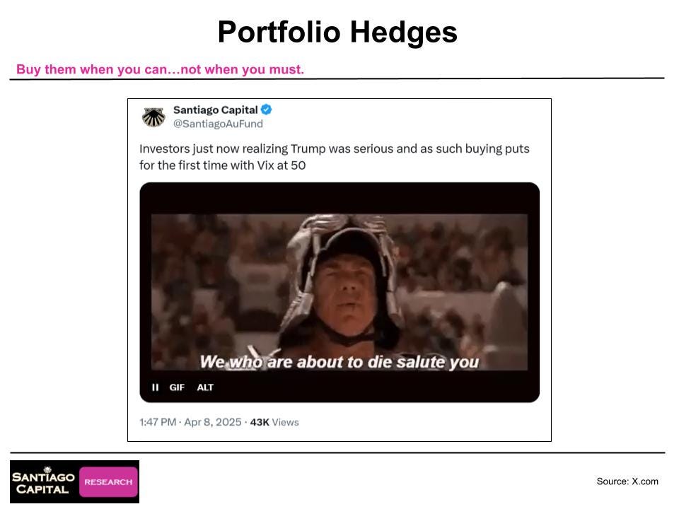 True to form, he sold the bulk of his puts during the April 8 spike, locking in massive gains. He’s rolled down a few, maintaining partial hedges, but mostly took profits.