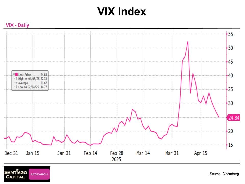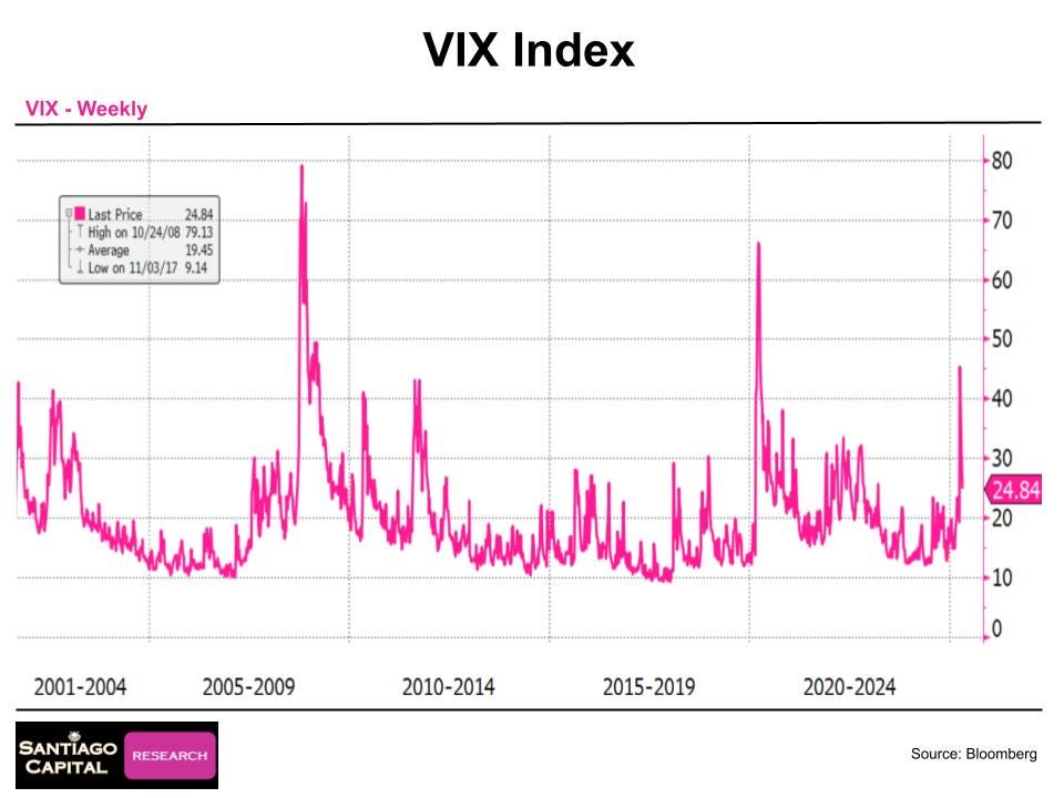 Today, markets are calmer. The S&P 500 has recovered much of its losses. Gold gave back some gains but remains well-bid. The VIX has retreated to below 25.