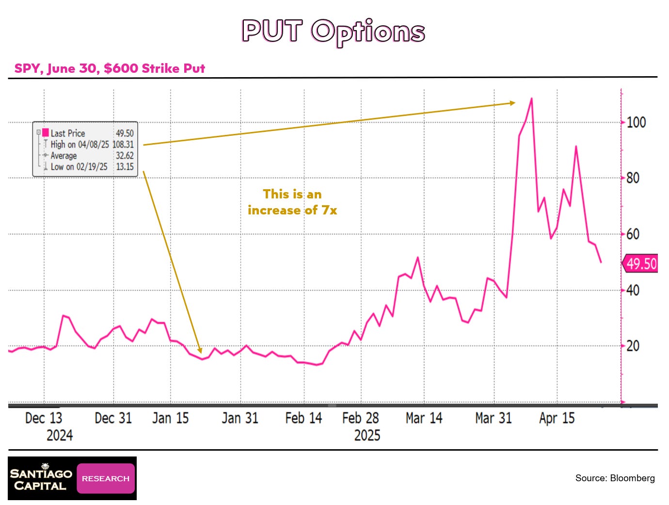 April 8: SPY plunges to 497. The put rockets to $108…a stunning 7x gain.