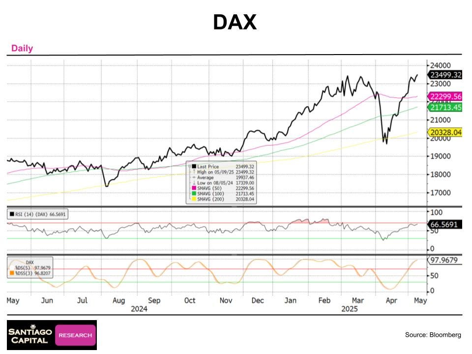 International markets? Similar picture. The DAX is at all-time highs, but stochastics are at 98. Momentum can’t get much higher.