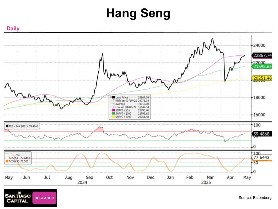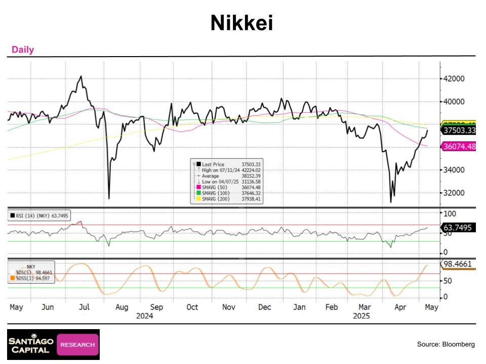 The Nikkei has bounced 15–20% off the lows but now bumps into both the 50-day and 200-day MAs…stochastics, again, at 98.