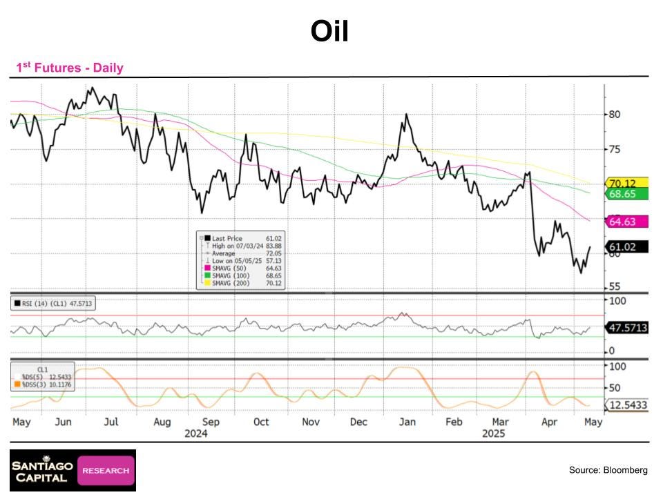 Oil dropped to $57–58, then bounced to just above $60. No conviction. Stochastics are low. RSI is neutral.