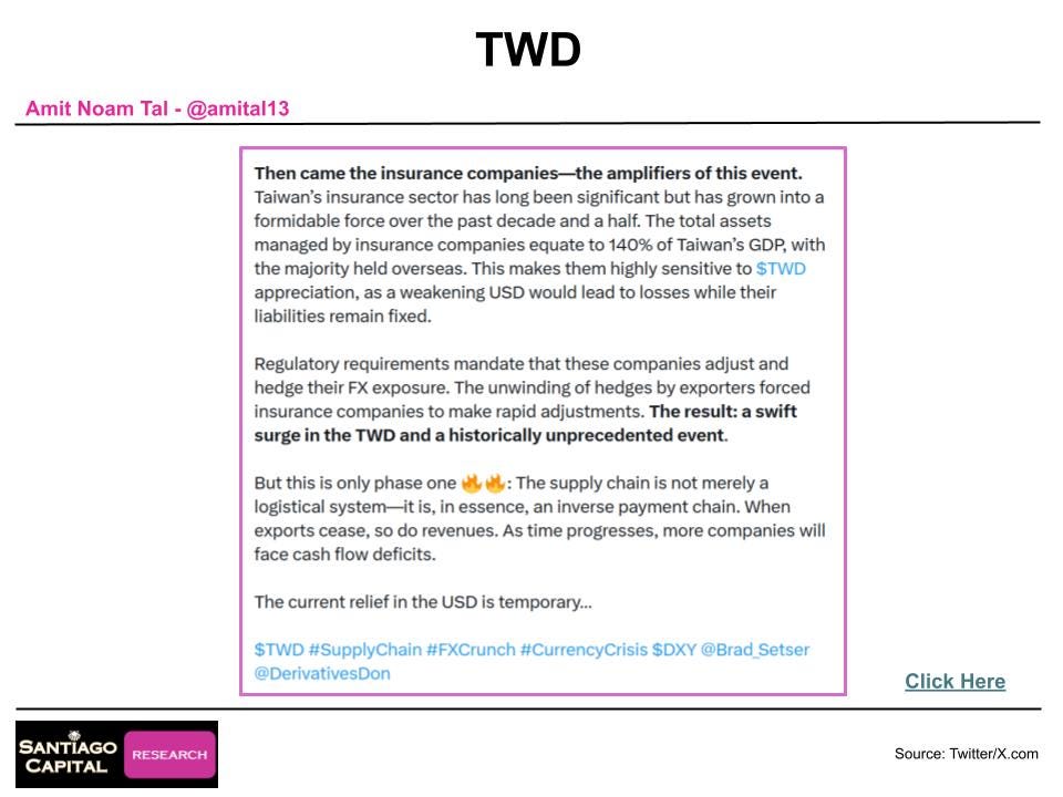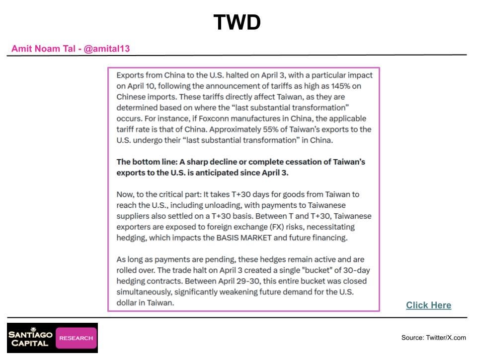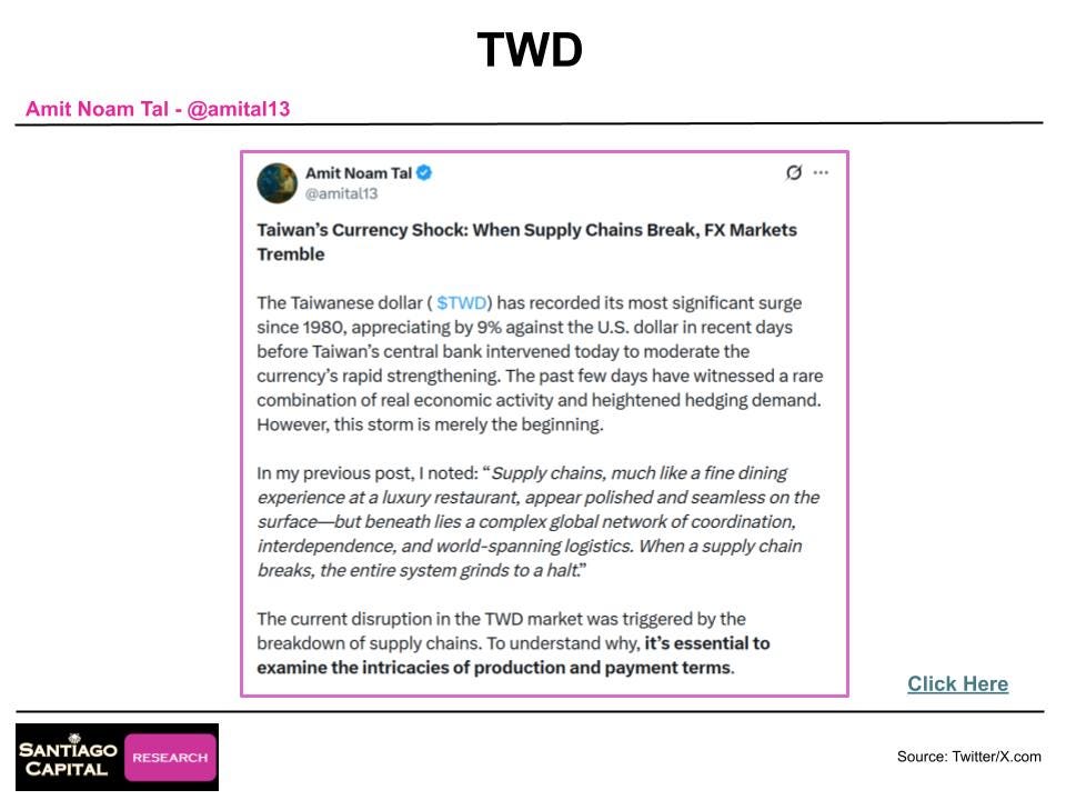 The Taiwan dollar just had a 9–10% move. Its biggest move in over 40 years. That doesn’t happen without something breaking. This wasn’t speculation. This was forced activity.