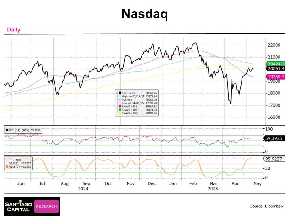 - RSI approaching extremes (above 70 or below 30). Right now, most indices are in "no man's land" (mid-50s to 70).