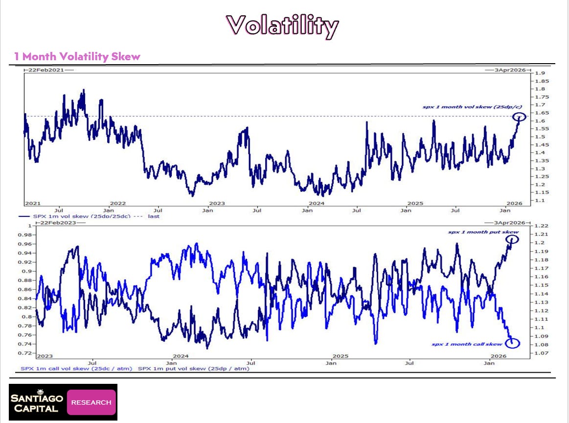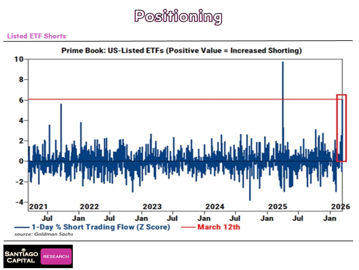 That means the fear embedded in market positioning is running far hotter than the headline number suggests. People aren’t just nervous. They are aggressively buying insurance against a sharp move lower. Put/call ratios, while not yet at last April’s extremes, are trending hard in that direction. Short positioning on broad ETFs is near multi-year highs outside of that same April window.