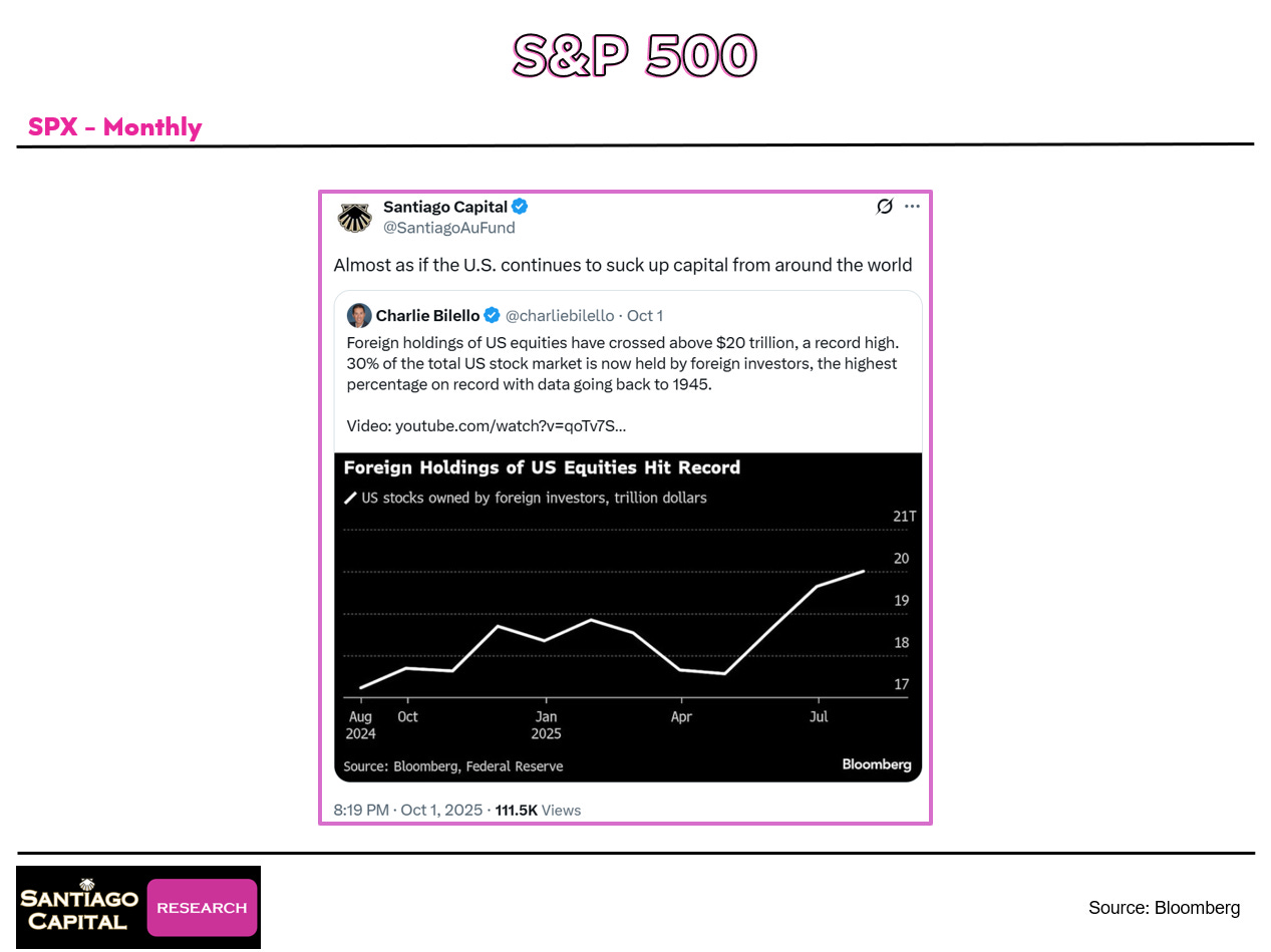 Foreign holdings of U.S. equities just hit records, embodying the “dollar milkshake theory”…America’s yard draws global capital like a thick shake through a straw.