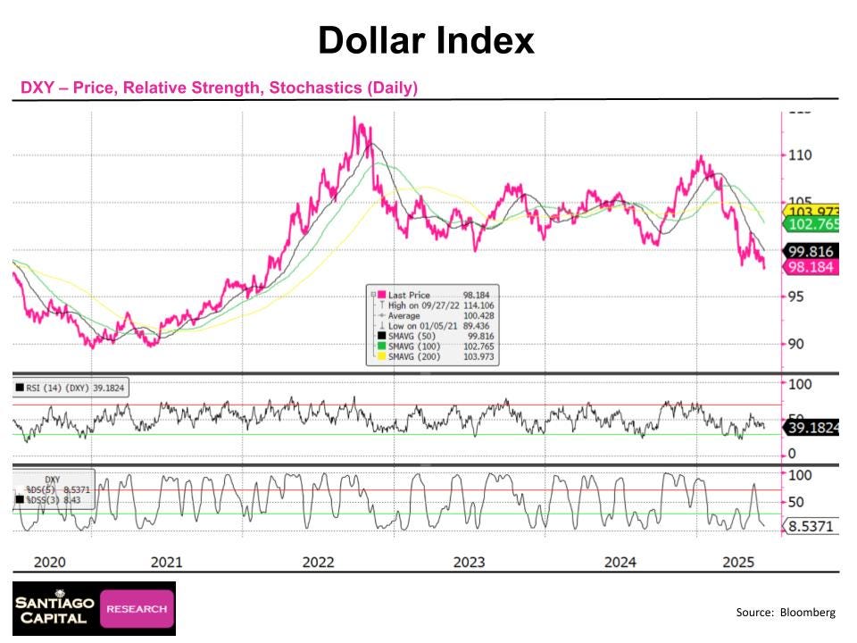 Relative Strength Index (RSI) and stochastic indicators further illuminate the dollar’s position. Over a five-year period, the DXY’s RSI stands at 35, low but not extreme.