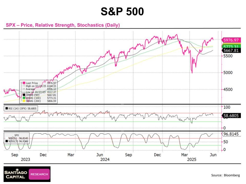 The VIX, a measure of market volatility, remains subdued despite recent geopolitical tensions, with stochastics recently at 2-3 before a modest bounce to 20.