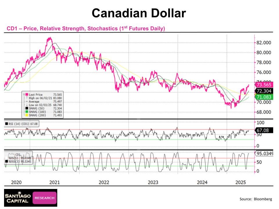 In contrast, the euro’s RSI and stochastics are elevated, nearing overbought territory, while the Canadian dollar shows similar overbought signals.