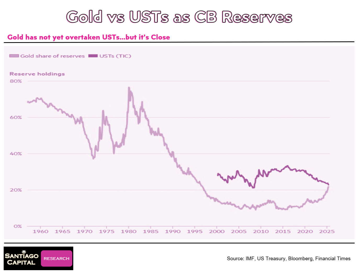 A chart making the rounds in financial circles paints a stark picture…gold’s share of reserves climbing steadily, while Treasuries’ portion plummets.