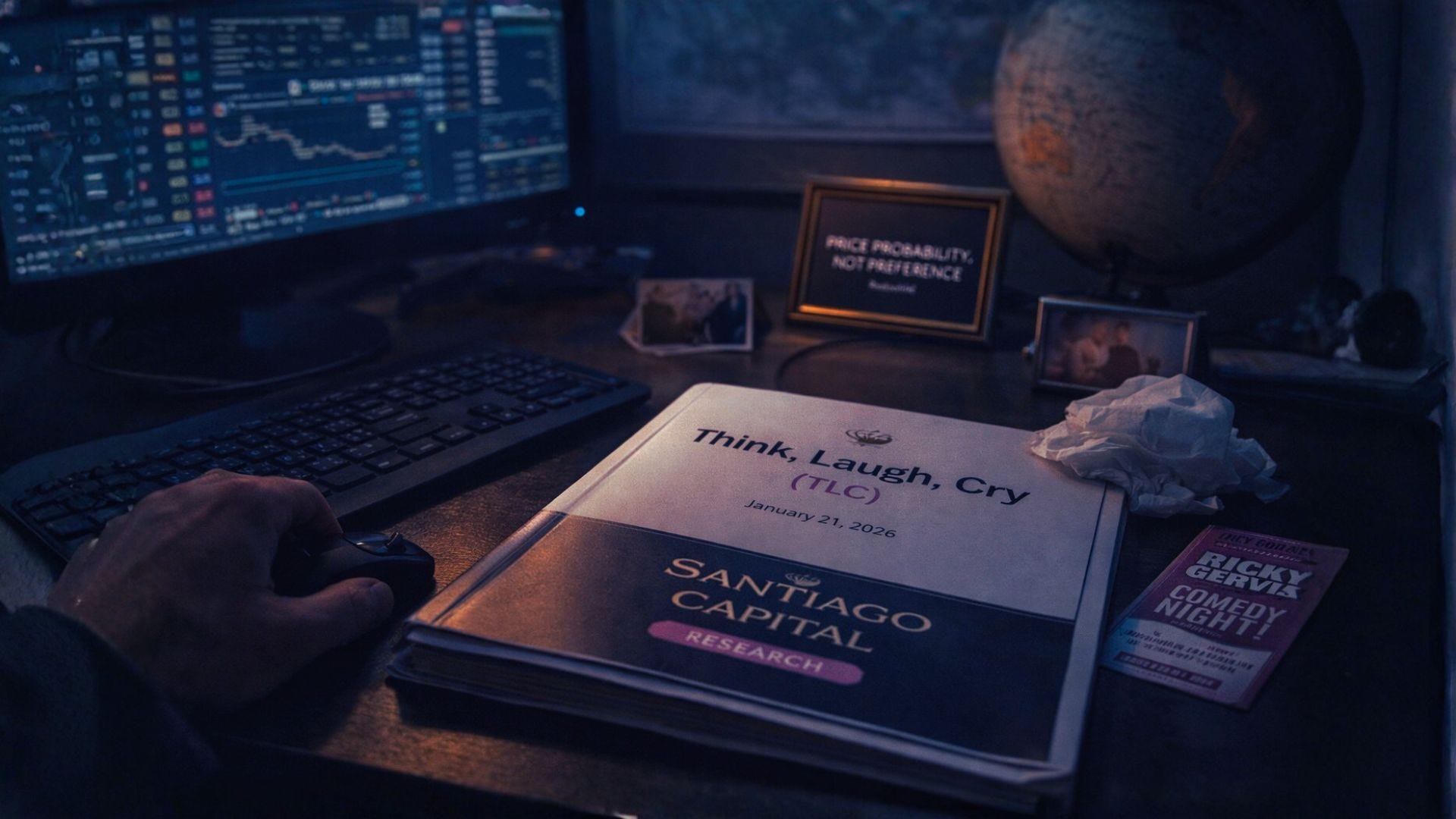 Think, Laugh, Cry Issue #36What if your portfolio bias isn’t fear...but morality? This piece explores the moment probability collides with identity. Which do you really price?Santiago CapitalJan 21, 2026∙ PaidShareSubscribeThis post is for subscribers in the Santiago Capital Pro planUpgrade to Santiago Capital ProAlready in the Santiago Capital Pro plan? Sign inPreviousNext